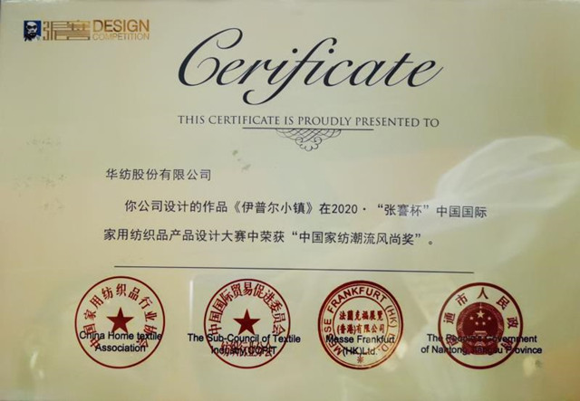 導讀:9月2日,以“潮流·生活”為主題的2020·“張謇杯”中國國際家用紡織品產(chǎn)品設(shè)計大賽頒獎盛典在江蘇南通舉行。公司家紡作品《伊普爾小鎮(zhèn)》,榮獲“中國家紡潮流風尚獎”。